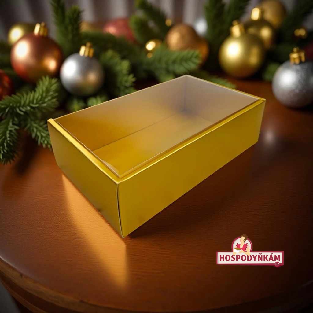 Luxusní a elegantní krabička určená pro balení vánočního cukroví, drobných zákusků, donutů nebo dalších pochutin, ale i menších dárků. Krabička kombinuje slavnostní zlaté papírové dno s průhledným plastovým víkem, které umožňuje atraktivní prezentaci obsahu. Pokud si přejete obsah zakrýt, lze pod víko vložit papírovou vložku ve stejné zlaté barvě, která je součástí balení.