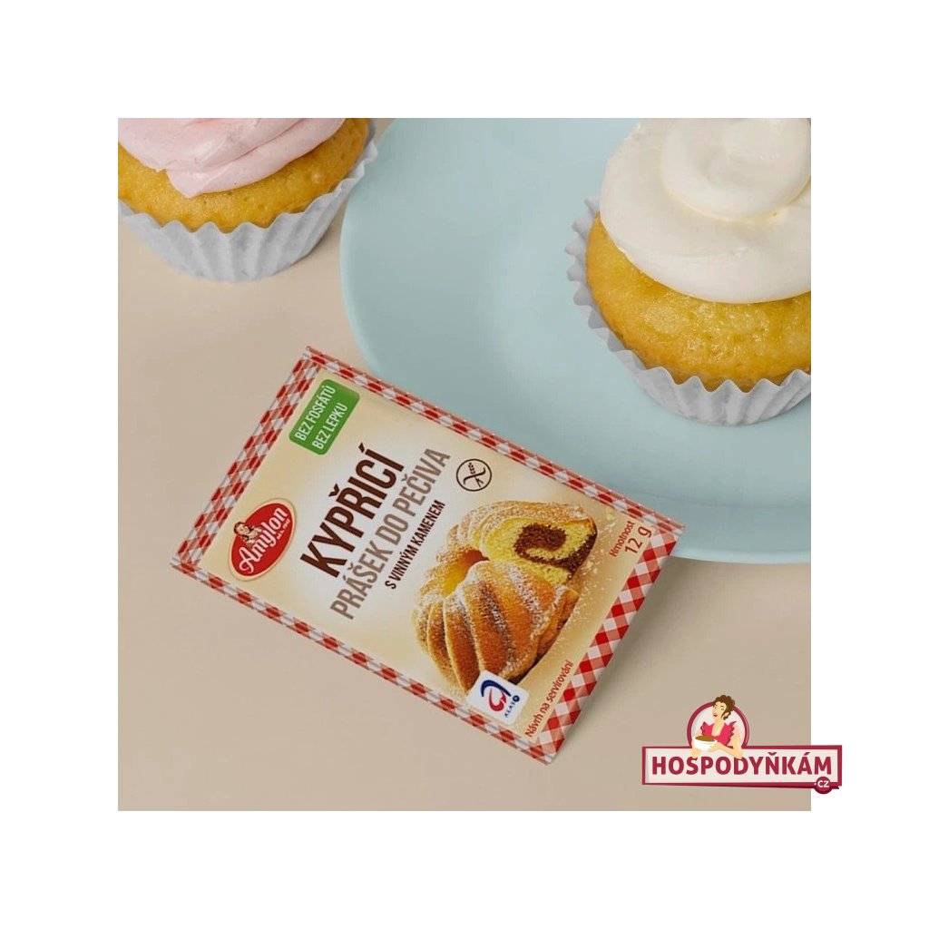 Hlavní kypřicí složkou je vinný kámen, přírodní minerál získávaný z usazenin po fermentaci vína. Díky tomu je prášek bez fosfátů, které mohou u citlivějších osob způsobovat pálení žáhy. Složení je navíc šetrné k zažívání, takže si pečené dobroty může bez obav dopřát celá rodina. Doporučené dávkování se liší podle typu těsta – u třeného těsta použijte celý sáček, u křehkého dvě třetiny a u knedlíkového postačí třetina obsahu.