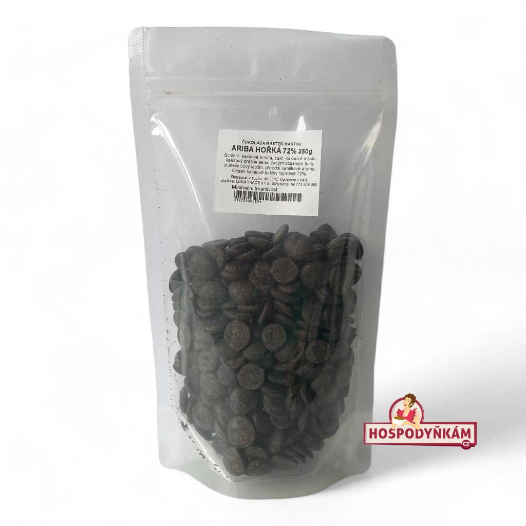 Vysoce kvalitní hořká čokoláda s minimálním obsahem kakaové sušiny 72% má luxusní, sametově jemnou chuť a je přirozeně bezlepková. Tato čokoláda je ideální jak pro zdobení cukrářských výrobků, tak pro přímou konzumaci. Ariba Hořká čokoláda 72% je tu pro všechny milovníky intenzivní hořké chuti.