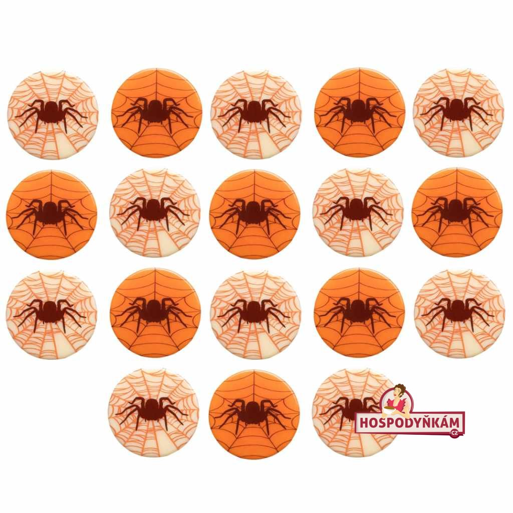 Vytvořte jedinečnou halloweenskou atmosféru na svých dortech, muffinech nebo zákuscích s kulatými čokoládovými dekoracemi s motivem černého pavouka v síti! Tyto ozdoby jsou vyrobeny z kvalitní bílé čokolády a dodávají se v oranžové a bílé variantě (náhodný mix barev).