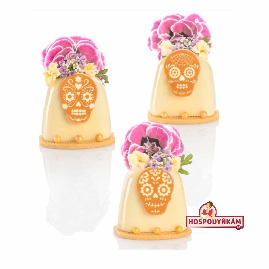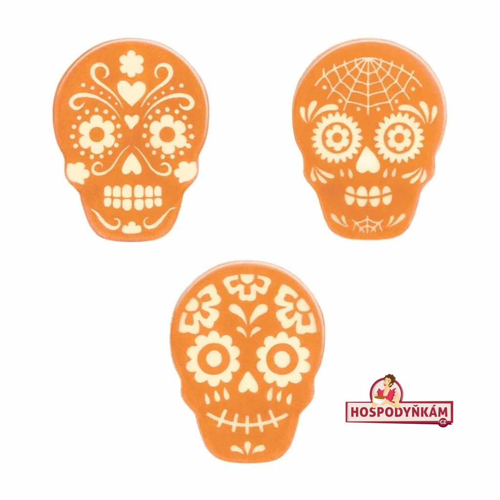 Originální dekorace z barvené bílé čokolády ve tvaru tradičních Calaveras jsou ideální volbou pro ozdobení halloweenských sladkostí. Každá lebka je pečlivě vyřezána a zdobena oranžovou barvou se světlými ornamenty, což jí dodává autentický a veselý vzhled inspirovaný mexickým svátkem Día de los Muertos. V balení naleznete tři různé motivy, které promění každý dort, cupcake či dezert v jedinečné mistrovské dílo.