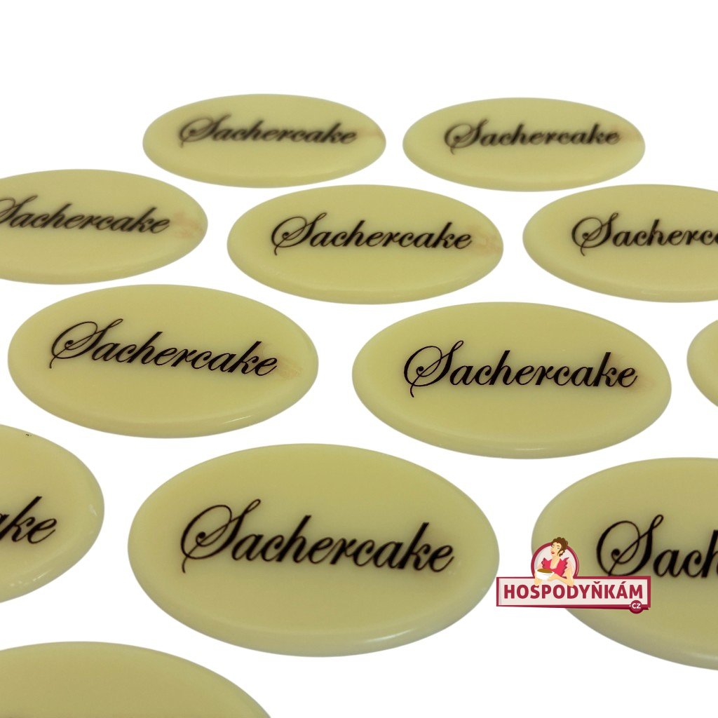 - Tvar: oválek s tmavým nápisem „Sachercake“