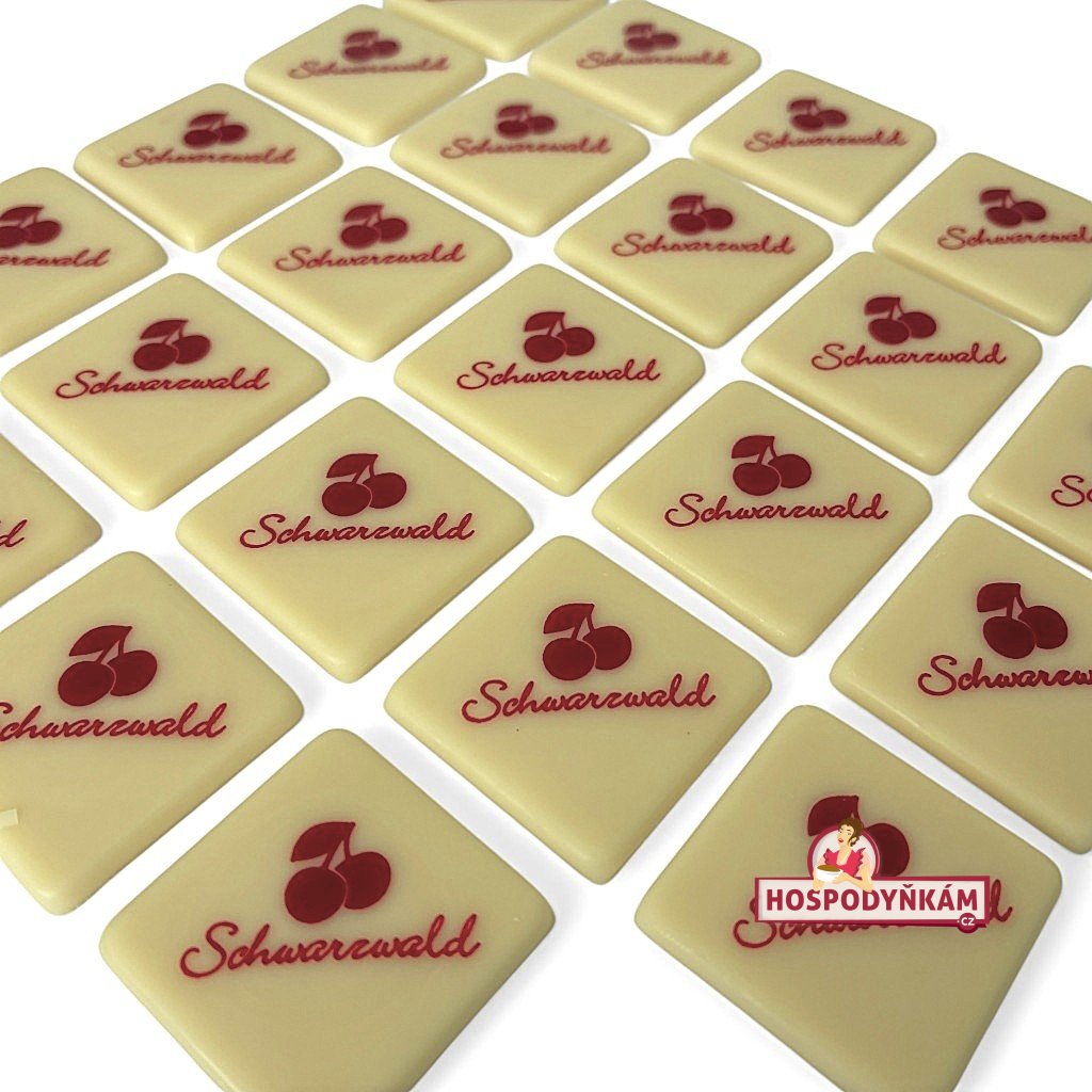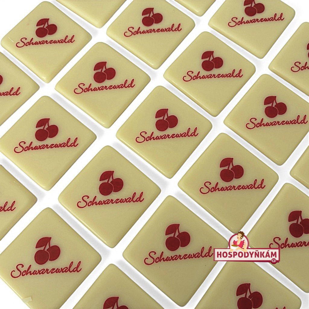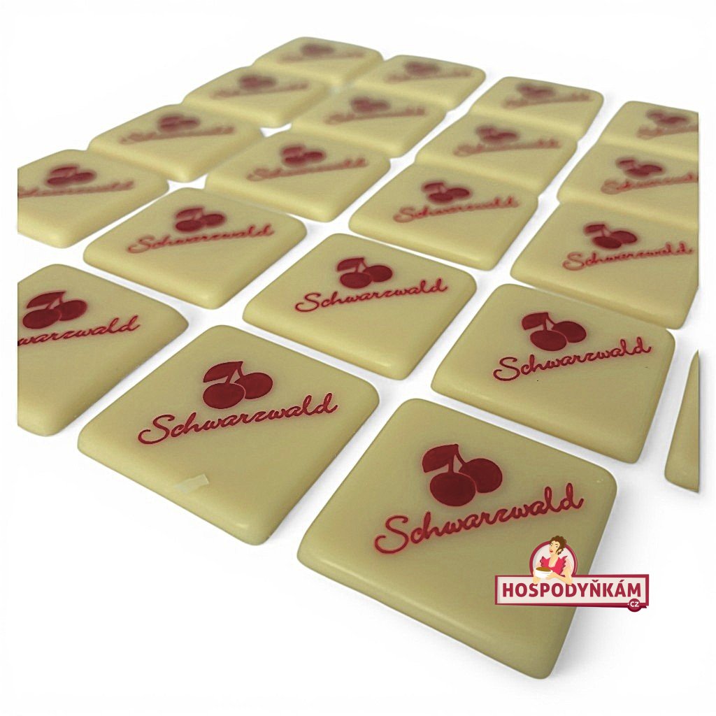 Čokoládová dekorace Schwarzwald je elegantní ozdoba z bílé čokolády, která se skvěle hodí ke zdobení dortů, zákusků i monoporčních dezertů typu Schwarzwald. Každý čtvereček o rozměru 3 × 3 cm je potištěn červeným nápisem „Schwarzwald“ a malým obrázkem třešní, což okamžitě evokuje klasický dort Schwarzwald s nadýchaným šlehačkovým krémem a višněmi.