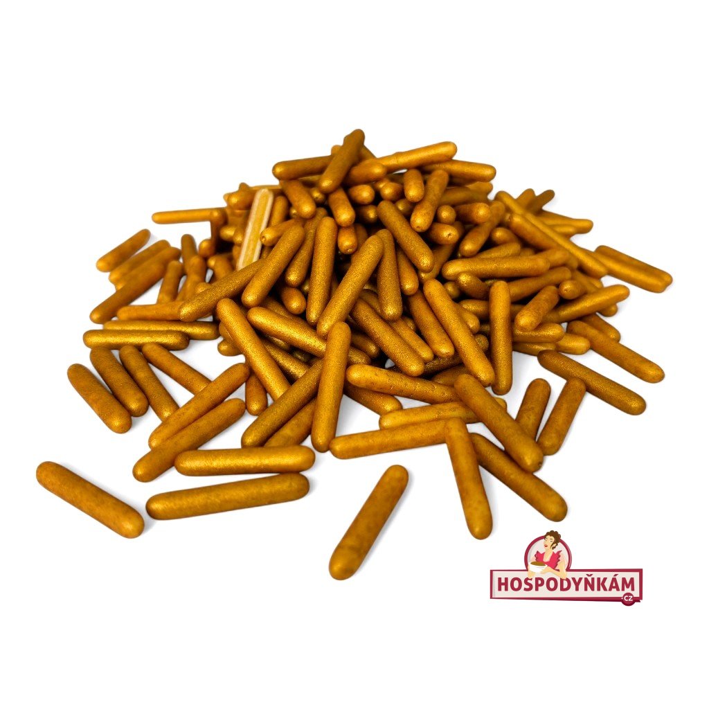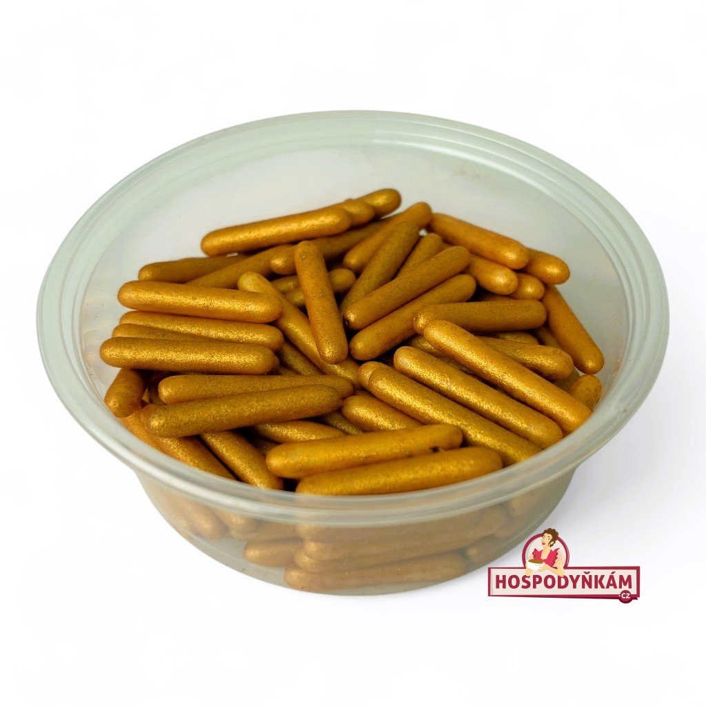 Perleťově zlaté cukrové tyčinky dodají vašim dortům, cupcakům, zákuskům i dalším sladkostem elegantní a slavnostní vzhled. Každá tyčinka měří přibližně 2 cm a v balení najdete zhruba 90 kusů – ideální množství pro originální zdobení na každou příležitost.