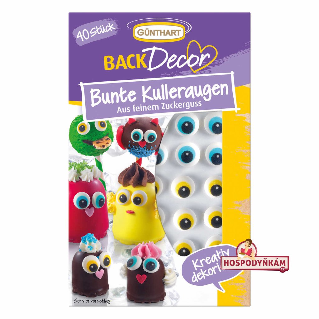 - Veselý design: kulaté oči s barevnými okraji (modrými a žlutými) dodávají cukrářským výrobkům živost a osobitost.