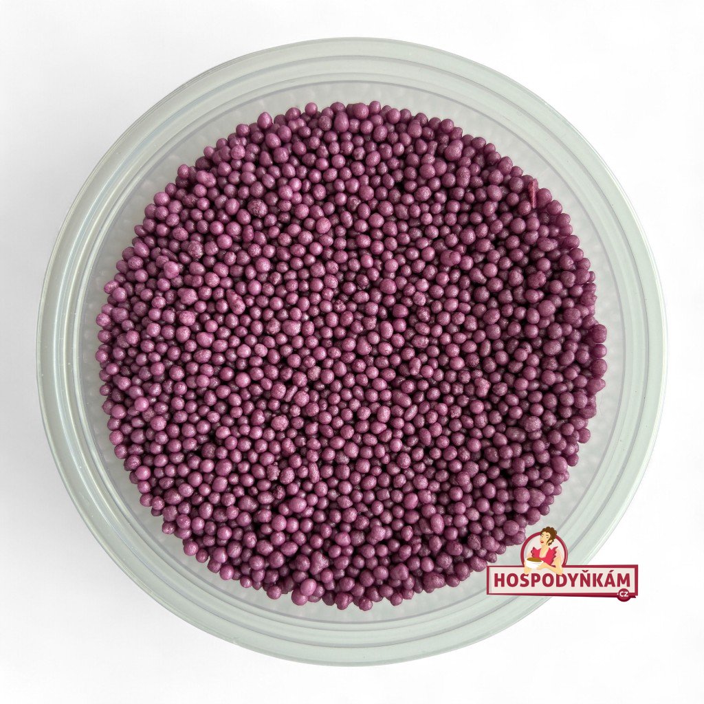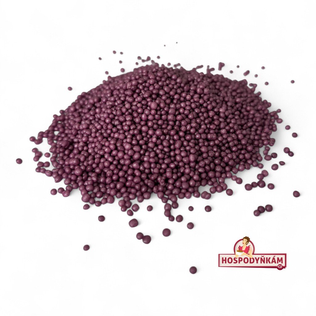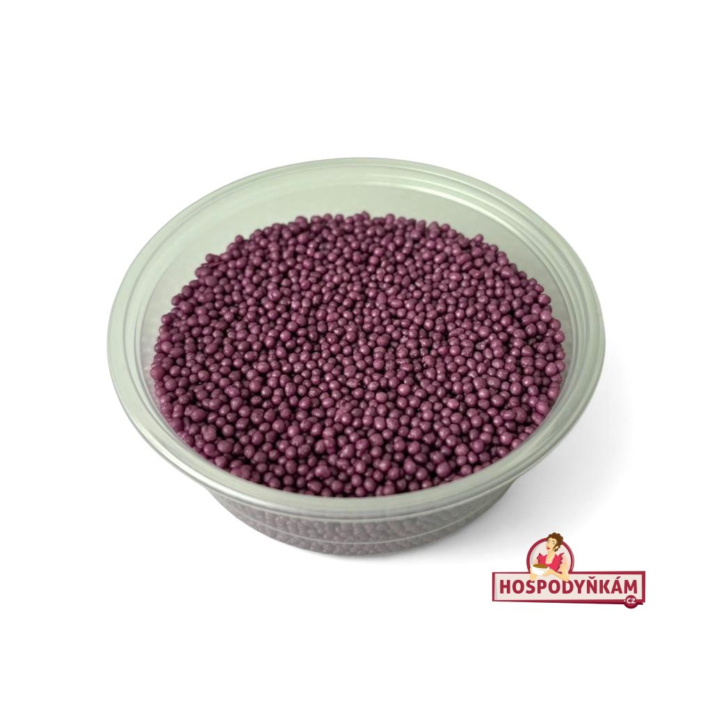 Fialový cukrový máček je jemná a lehká dekorace, která dodá vašim dortům, zákuskům, cupcakům i dalším cukrářským výrobkům originální vzhled. Díky drobným zrníčkům o průměru cca 1,5 mm a syté fialové barvě snadno vytvoříte efektní ozdobu, která upoutá pozornost na každé sladké tabuli.