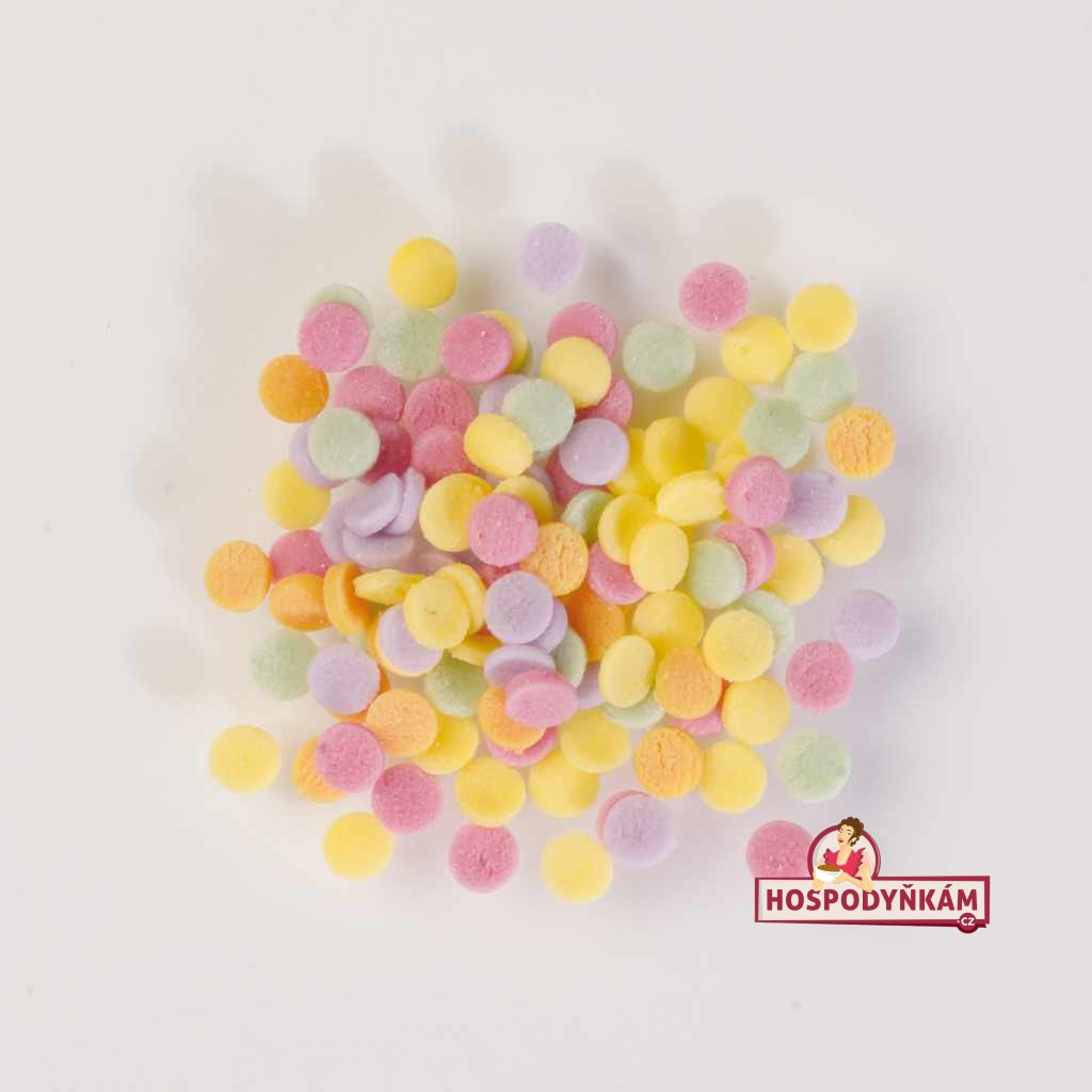 Chcete svým dortům, muffinům nebo cupcakes dodat veselý a hravý vzhled? Cukrové zdobení ve tvaru mini konfet je přesně to pravé! Tato drobná barevná kolečka v pastelových odstínech jsou ideální jako jemný posyp na krém, polevu nebo čokoládu. Stačí je jednoduše nasypat na hotový moučník a během chvilky vykouzlíte slavnostní a barevný efekt, který potěší děti i dospělé.