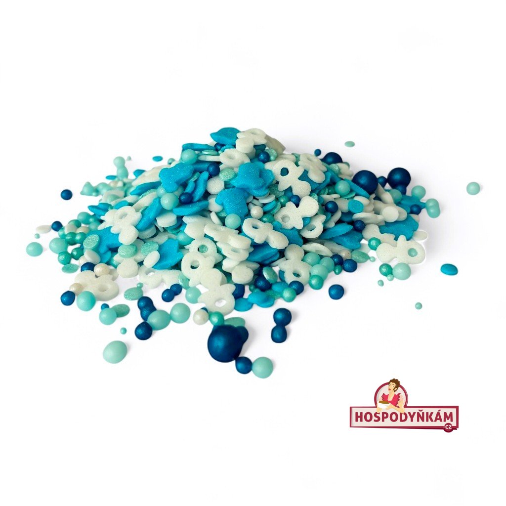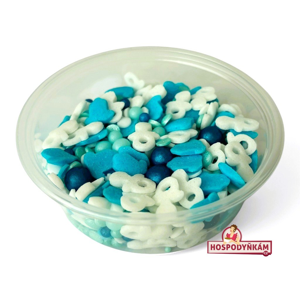 Tento modro-bílý mix cukrového zdobení ve tvaru dudlíků, kuliček, máčků a konfet je skvělou volbou pro oslavu narození chlapečka nebo pro party k odtajnění pohlaví miminka. Najdete v něm vše, co potřebujete k tomu, aby vaše sladké dobroty získaly roztomilý a slavnostní vzhled.