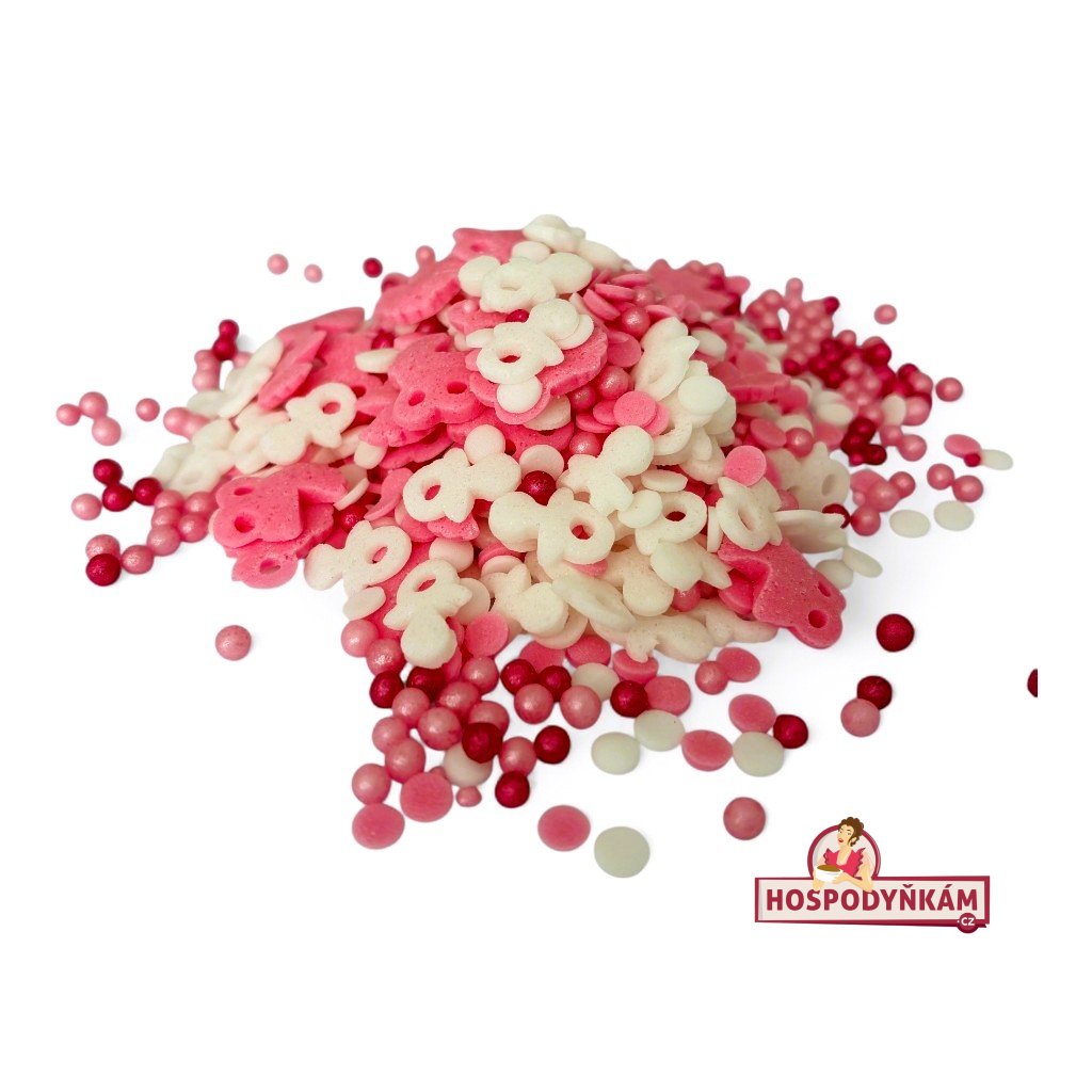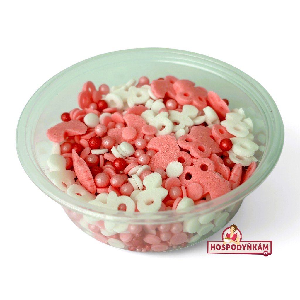 - Růžovo-bílý mix dudlíků, kočárků, kuliček, máčků a konfet