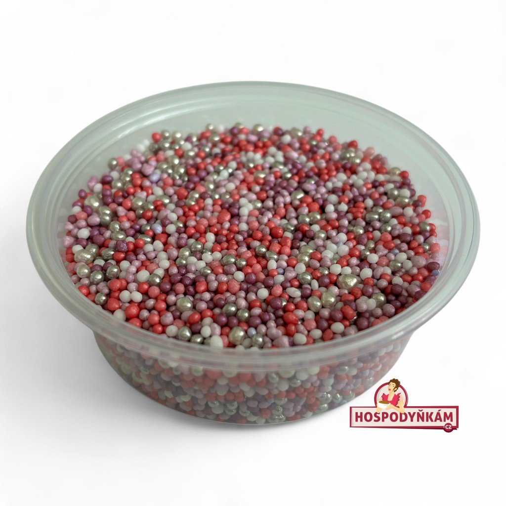 Cukrový máček Růžový mix je perfektní volbou pro všechny cukrářské výrobky. Kombinace perleťově bílé, světle růžové, tmavě růžové, světle fialové, tmavě fialové a stříbrné vytváří harmonický a vkusný vzhled, který ozdobí každý dort, cupcake, zákusek nebo sušenku. Perleťové perličky o průměru 1,5 mm jemně křupou a snadno přilnou k polevám i krémům. Díky pestrým barvám dodají vašim sladkostem elegantní a slavnostní vzhled.