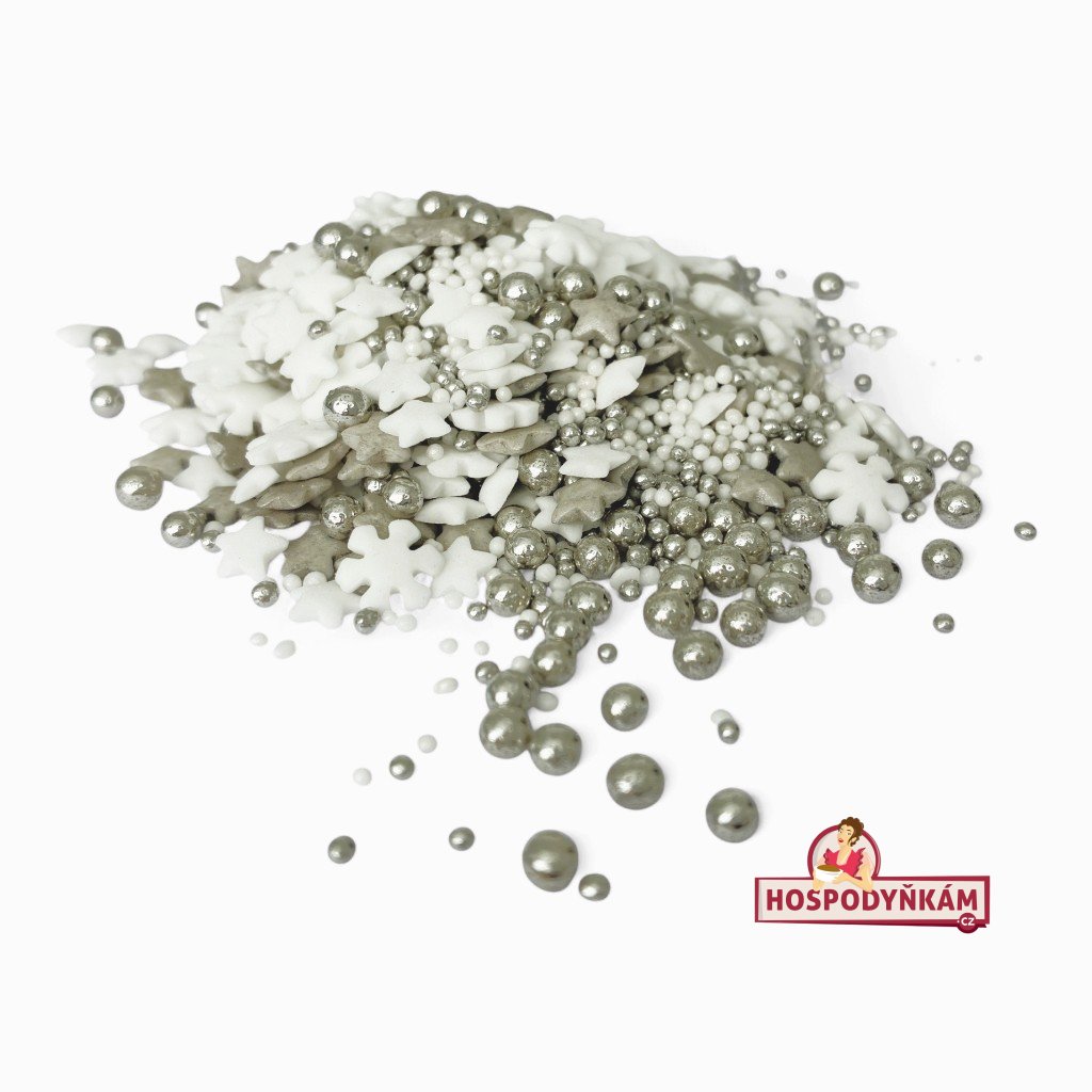 Tento mix cukrového zdobení ve tvaru bílých sněhových vloček, stříbrných a bílých hvězdiček, stříbrných kuliček a bílého i stříbrného máčku je ideální volbou pro slavnostní zimní dekorace. Najdete v něm vše, co potřebujete k tomu, aby vaše vánoční cukroví a dorty získaly opravdu kouzelný vzhled.