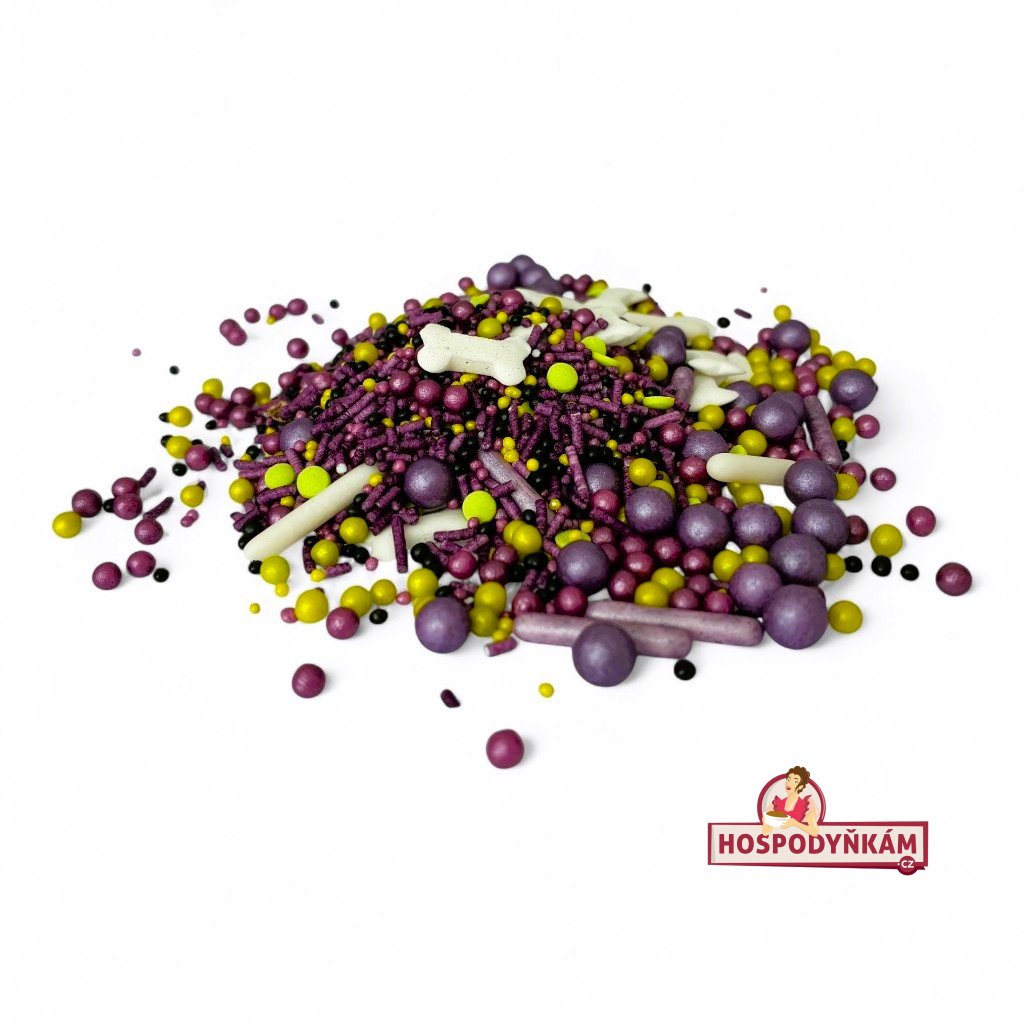 Tento mix cukrového zdobení v typických halloweenských barvách – bílé, černé, fialové a zelené – obsahuje máček, perličky, rýži, tyčinky, konfety a originální cukrové bílé kosti. Najdete v něm vše, co potřebujete, aby vaše sladké dobroty získaly hravý a strašidelný vzhled, který na žádné halloweenské oslavě nesmí chybět.