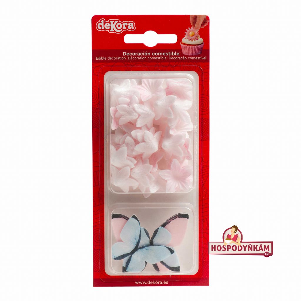 Vyřezávaná dekorace z jedlého papíru ve tvaru mini růžových kvítků, modrých a růžových motýlků.