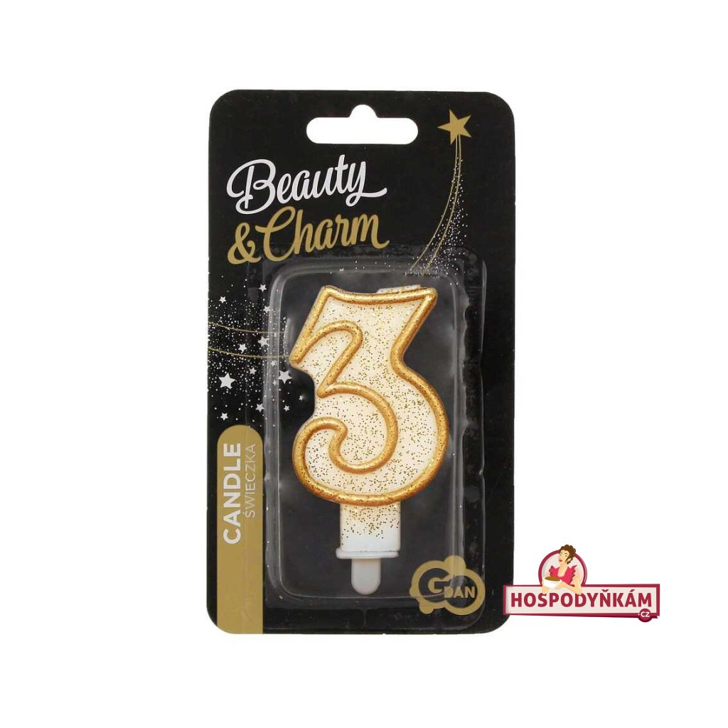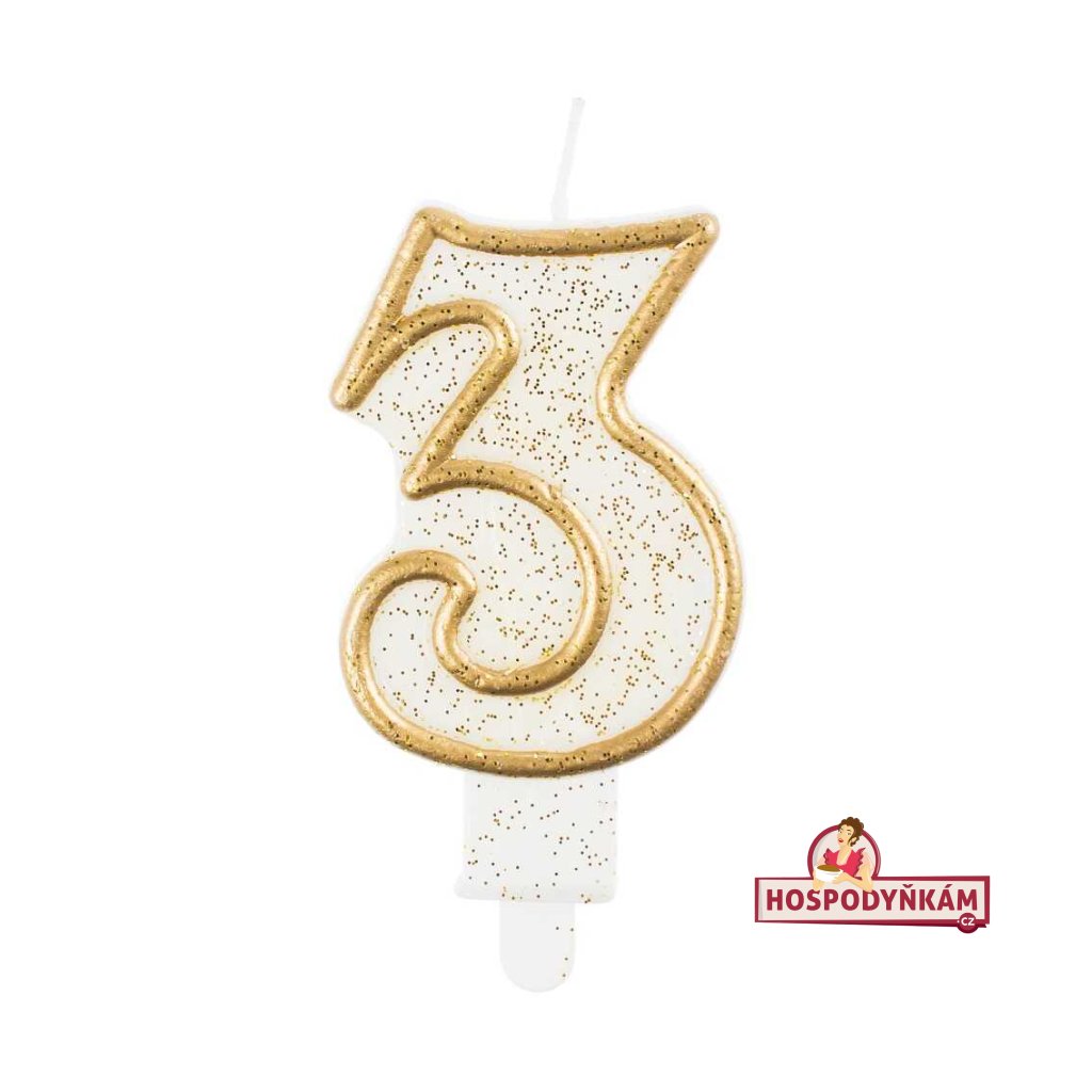 Dortová svíčka k oslavě narozenin je vyrobena ve tvaru čísla 3. Doplněna je zlatou konturou a třpytkami. Dominantní svíčka na každý dort. Elegantní svíčka pro každého.