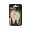 Velká dortová svíčka ve tvaru číslice 60 je vyrobena v bílé barvě se zlatou konturou a třpytkami.