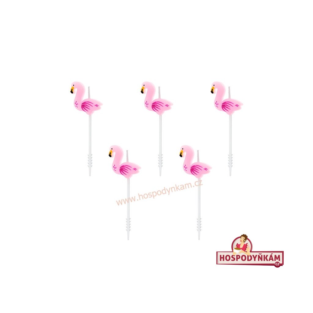 Sada obsahuje 5 kusů dortových svíček se zápichem ve tvaru růžových plameňáků.