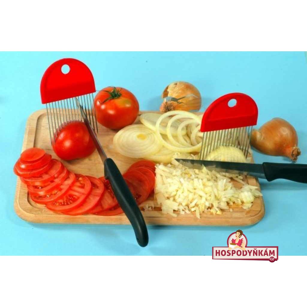 Každý, kdo se v kuchyni potýká s krájením cibule, rajčat nebo hub, jistě ocení praktický držák na krájení. Tento jednoduchý nástroj se stane vaším nepostradatelným pomocníkem při přípravě salátů, omáček i dalších pokrmů. Držák stačí zarazit napříč do rozpůlené cibule, mezi jeho jehlami bezpečně a rovnoměrně vedete nůž a během chvilky máte nakrájené pravidelné kostičky nebo plátky. Stejně dobře poslouží i při krájení rajčat, hub a dokonce i při čištění ryb.