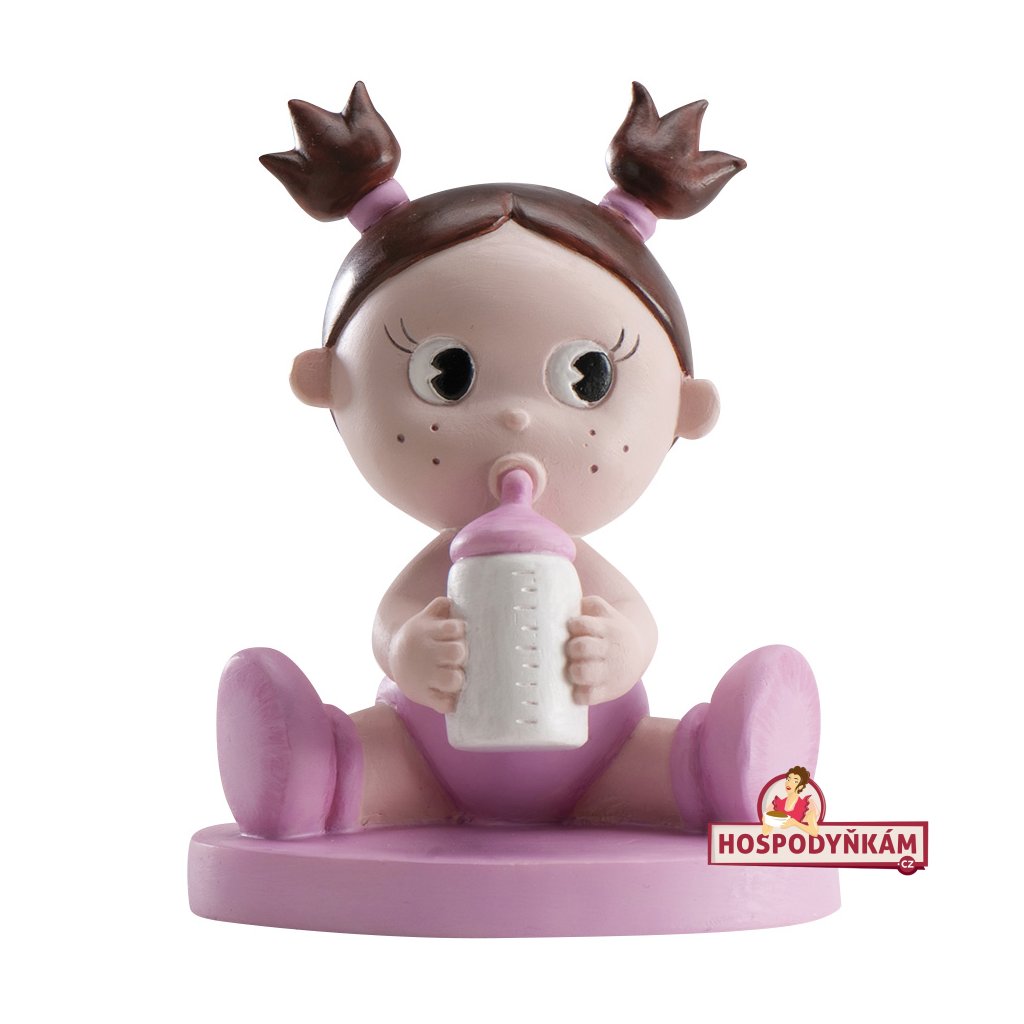 Nejedlá dekorace na dort - batole - sedící holčička s culíčky, která v ruce drží lahvičku s mlékem. Ideální pro zdobení dětských dortů.
