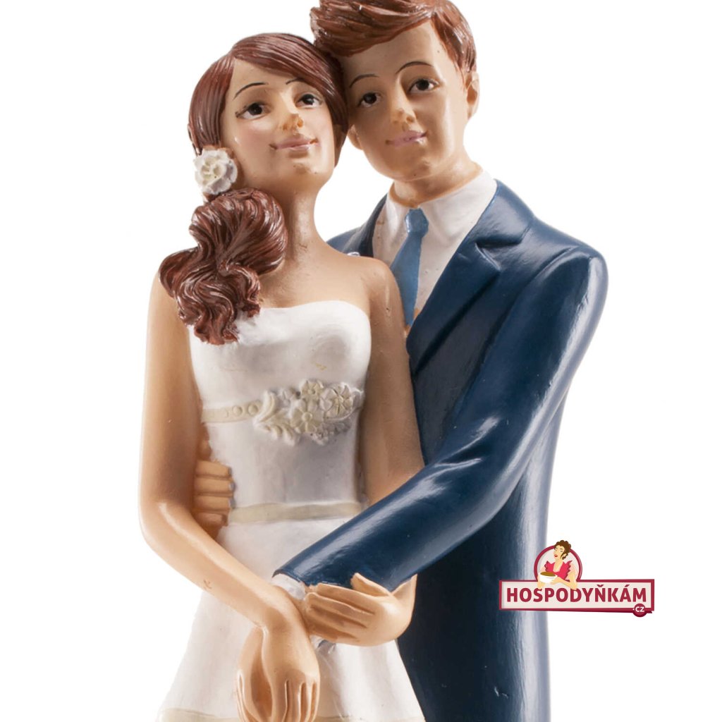 Nevěsta, s hnědými vlasy staženými do culíku, je oblečena do klasických bílých šatů s korzetem, které podtrhují její půvab a eleganci. Za ní stojí ženich, rovněž hnědovlasý, v moderním modrém obleku, jenž dokonale ladí s celkovým vzhledem páru. Jejich propletené ruce a zasněný výraz dodávají figurce na jemnosti a intimitě.
