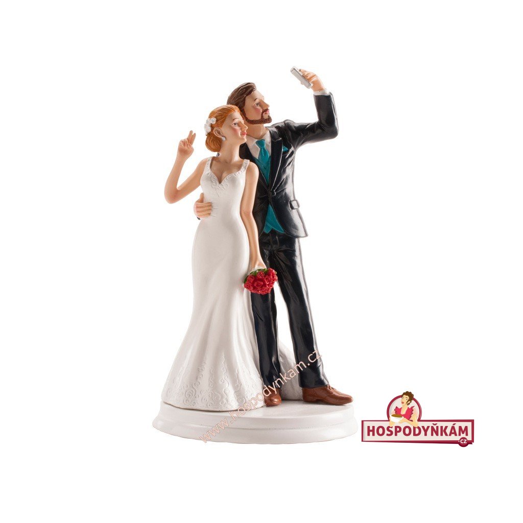 Nejdelá dekorace na svatební dort - ženich a nevěsta si fotí selfie.