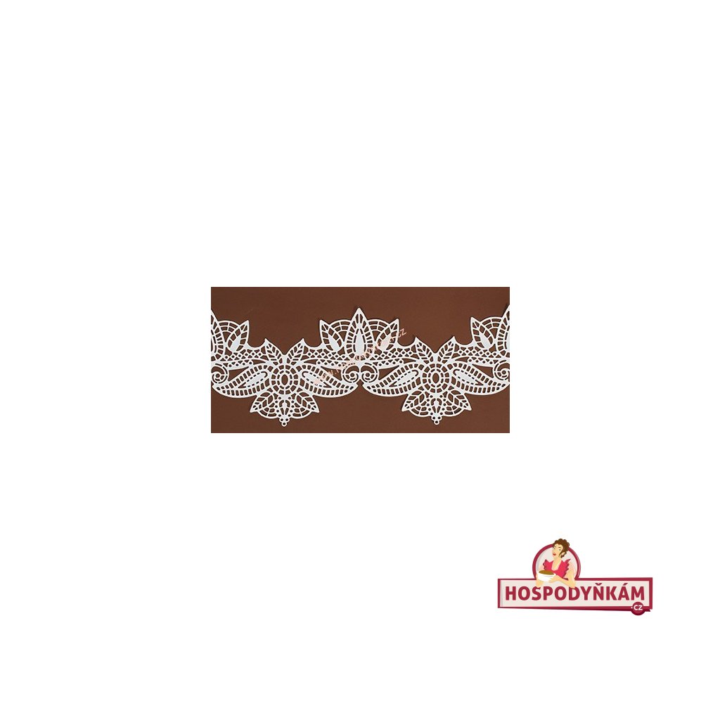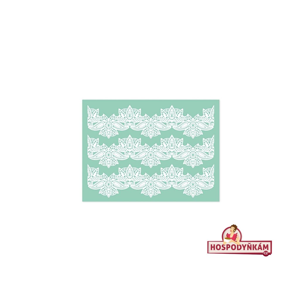 Silikonová forma na přípravu jedlé dekorace s krajkovým motivem. Jedlá krajka je oblíbenou pomůckou při zdobení slavnostních dortů.
