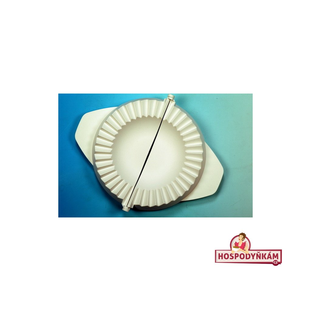 Rozválíme plát těsta o síle 4-5 mm. Spodní ostrou hranou tvořítka vykrojíme kolečko a položíme na ozubenou část. Do jedné poloviny vykrojeného kolečka dáme náplň.