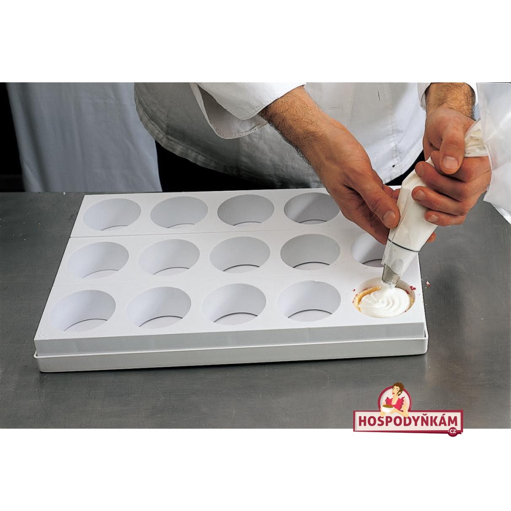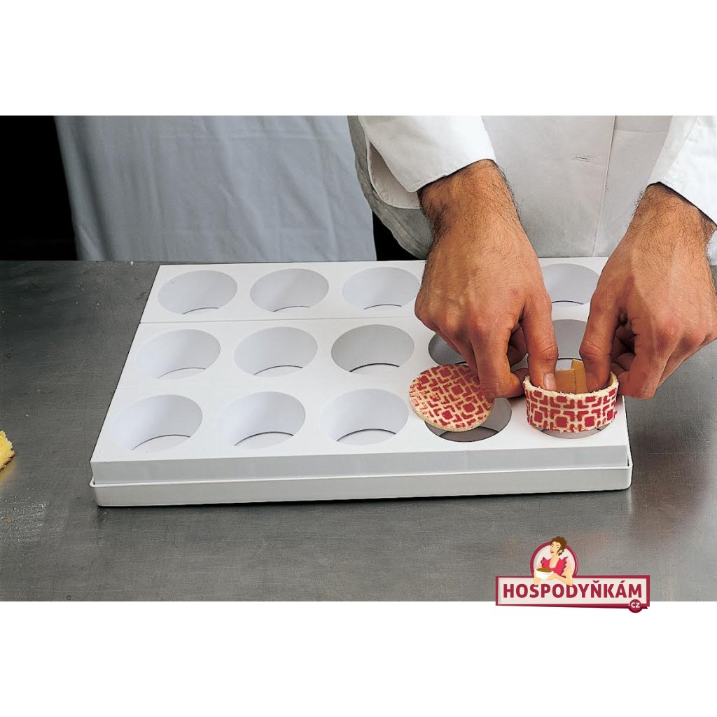 z upečeného piškotového plátu vykrájíme vykrajovátkem tvary, které vložíme do olejem vymazaných skupinových forem, naplníme krémem, necháme ztuhnout v chladničce. Po zatuhnutí umístíme formu na vytlačovací díl a tlakem formy směrem dolů vytlačíme hotové zákusky. Dozdobíme dle potřeby, servírujeme.