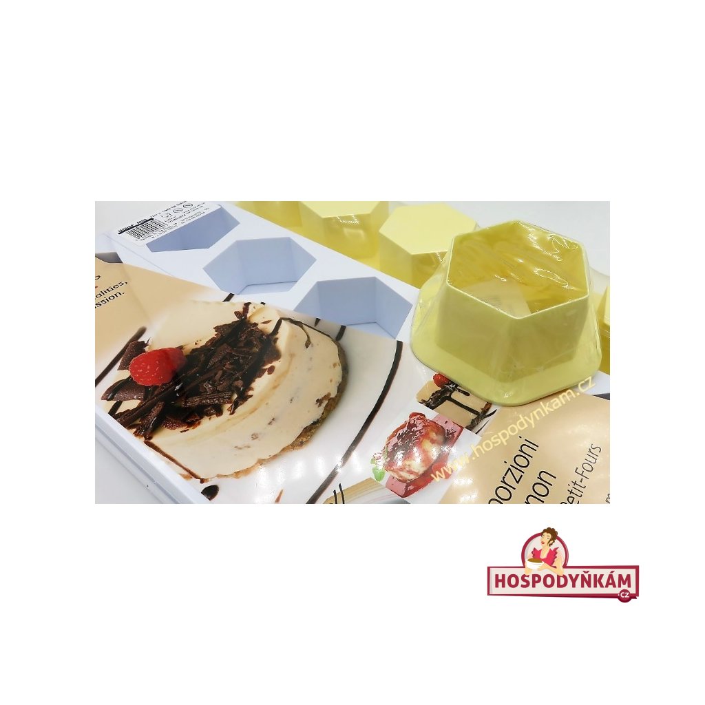 z upečeného piškotového plátu vykrájíme vykrajovátkem tvary, které vložíme do olejem vymazaných skupinových forem, naplníme krémem, necháme ztuhnout v chladničce. Po zatuhnutí umístíme formu na vytlačovací díl a tlakem formy směrem dolů vytlačíme hotové zákusky. Dozdobíme dle potřeby, servírujeme.