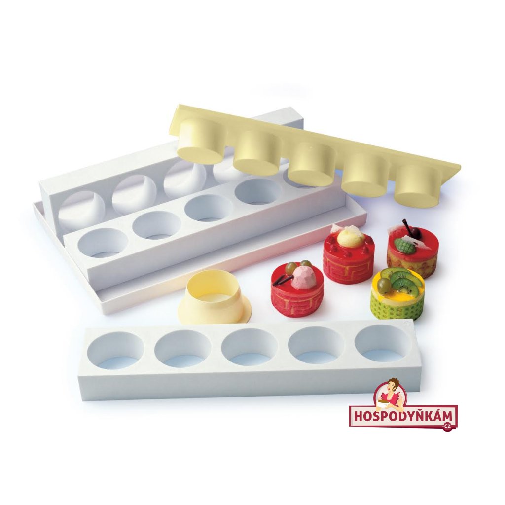 z upečeného piškotového plátu vykrájíme vykrajovátkem tvary, které vložíme do olejem vymazaných skupinových forem, naplníme krémem, necháme ztuhnout v chladničce. Po zatuhnutí umístíme formu na vytlačovací díl a tlakem formy směrem dolů vytlačíme hotové zákusky. Dozdobíme dle potřeby, servírujeme.
