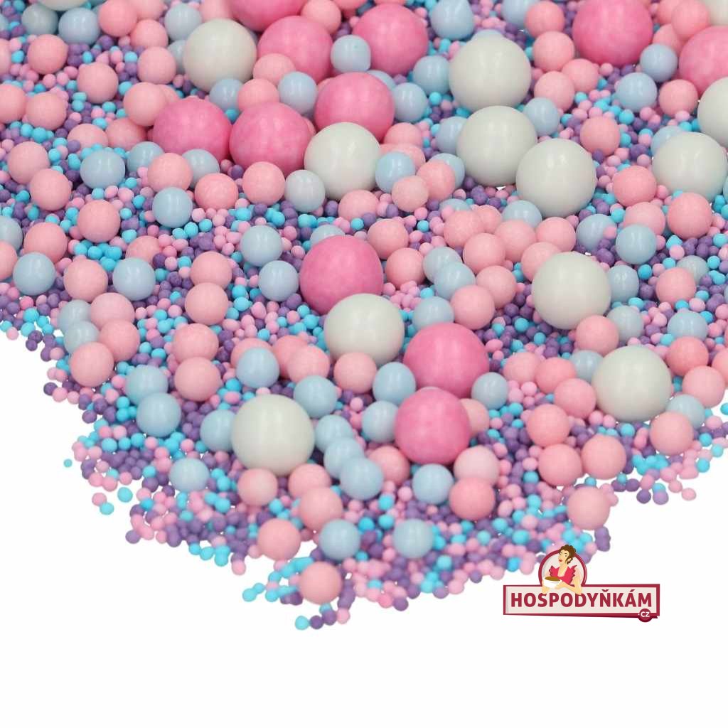Směs perel FunCakes Soft Pearl Mix Bubblegum Pop dodá vašim dortům, cupcakes i sušenkám krásný a veselý vzhled. Barevná kombinace odstínů růžové a modré v různých velikostech (od 1 mm do 1 cm) zaručí, že vaše sladké výtvory budou nepřehlédnutelné. Perly mají jemný skus a elegantní lesk, takže jsou ideální pro malé i velké mlsouny a pro každou slavnostní příležitost – od narozenin až po oslavy odhalení pohlaví dítěte (gender reveal).