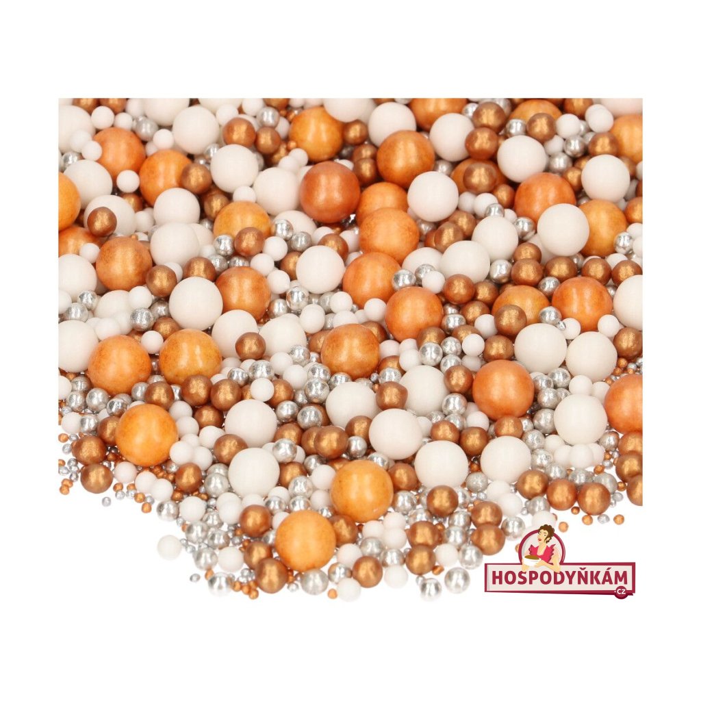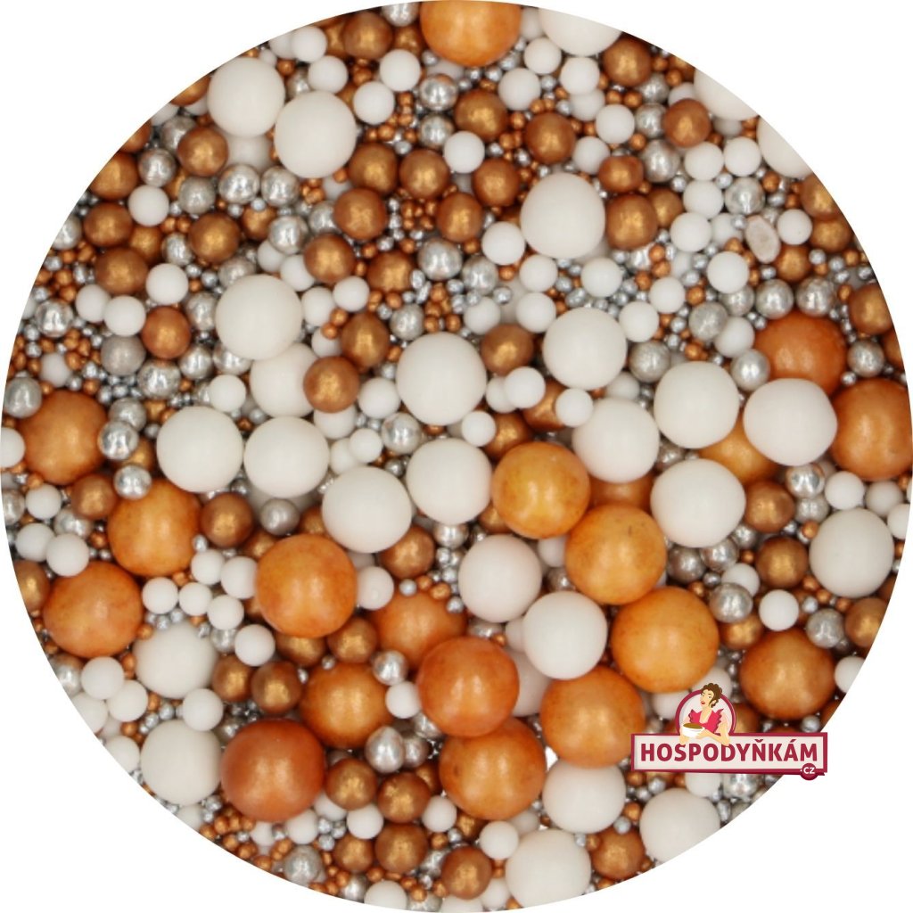 Luxusní směs jedlých perliček různých velikostí, které jsou jemné na skus a nádherně se lesknou. Díky elegantní kombinaci bílé, stříbrné a zlaté barvy jsou ideální volbou pro slavnostní příležitosti, jako jsou svatby, výročí, narozeniny nebo jiné speciální oslavy. Perly dodají vašim dortům, cupcakes, dezertům i drobným zákuskům sofistikovaný a slavnostní vzhled.