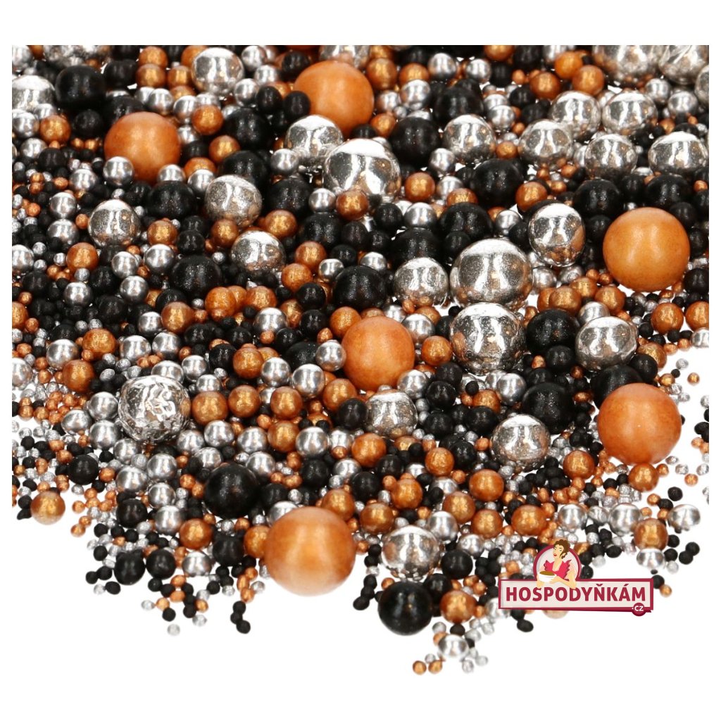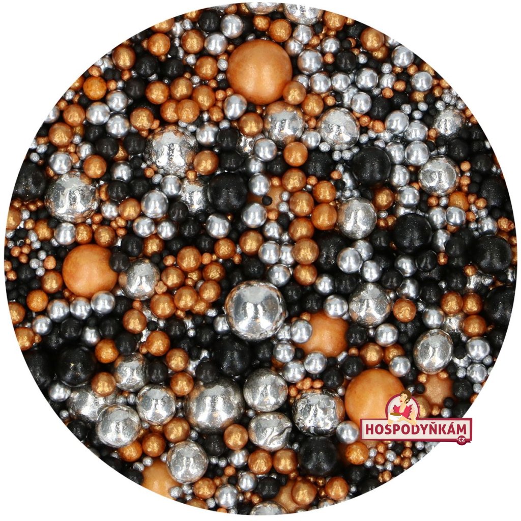 Exkluzivní směs jedlých perliček různých velikostí, které jsou jemné na skus a mají výrazný metalický lesk. Elegantní kombinace černé, stříbrné a zlaté barvy dodá vašim dortům, cupcakes, dezertům a dalším cukrářským výtvorům opravdu luxusní a slavnostní vzhled. Ideální volba pro svatby, oslavy výročí, narozeniny i další výjimečné příležitosti.