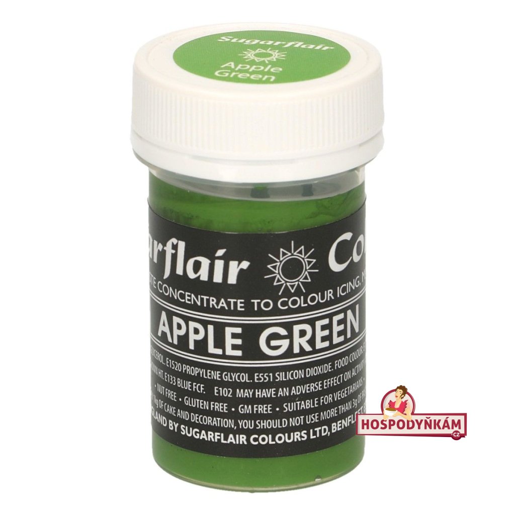 Objevte kouzlo gelové barvy Sugarflair Apple Green, která přináší do vaší kuchyně svěží a živou pastelovou zeleň. Tato 100% jedlá a bezlepková barva je ideální pro všechny potraviny na vodní bázi. S její pomocí můžete snadno barvit potraviny a vytvořit tak nádherné a oku lahodící dezerty, dorty a další sladké pochoutky. Přidejte trochu kouzla a kreativity do svého pečení se Sugarflair Apple Green!