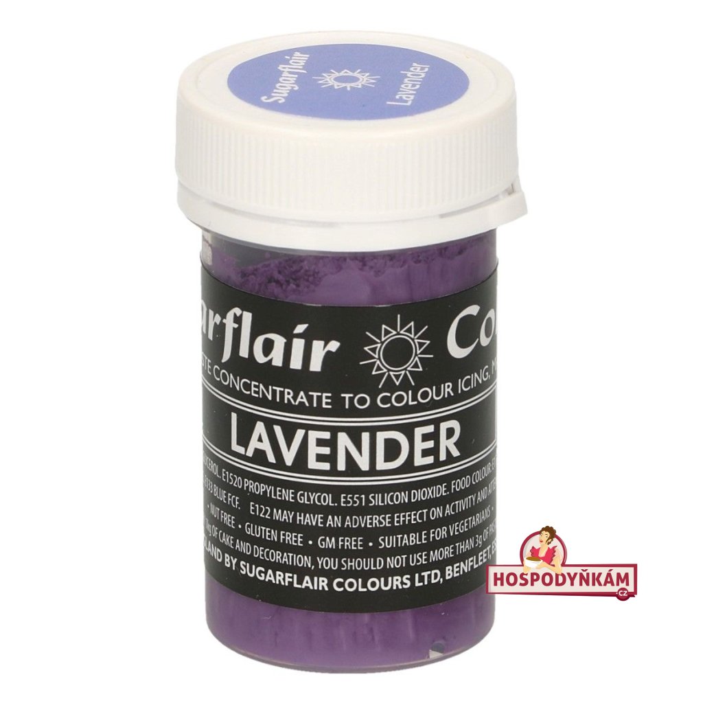 Dodejte svým dezertům jemný fialový odstín s gelovou barvou Sugarflair Lavender. Tato 100% jedlá barva je bez lepku, ořechů a GMO, což ji činí ideální pro vegetariány i vegany. Díky své vysoké koncentrovanosti stačí jen malé množství k dosažení krásné levandulové barvy. Barvu lze také použít k malování – rozmíchejte ji ve vodě nebo alkoholu.