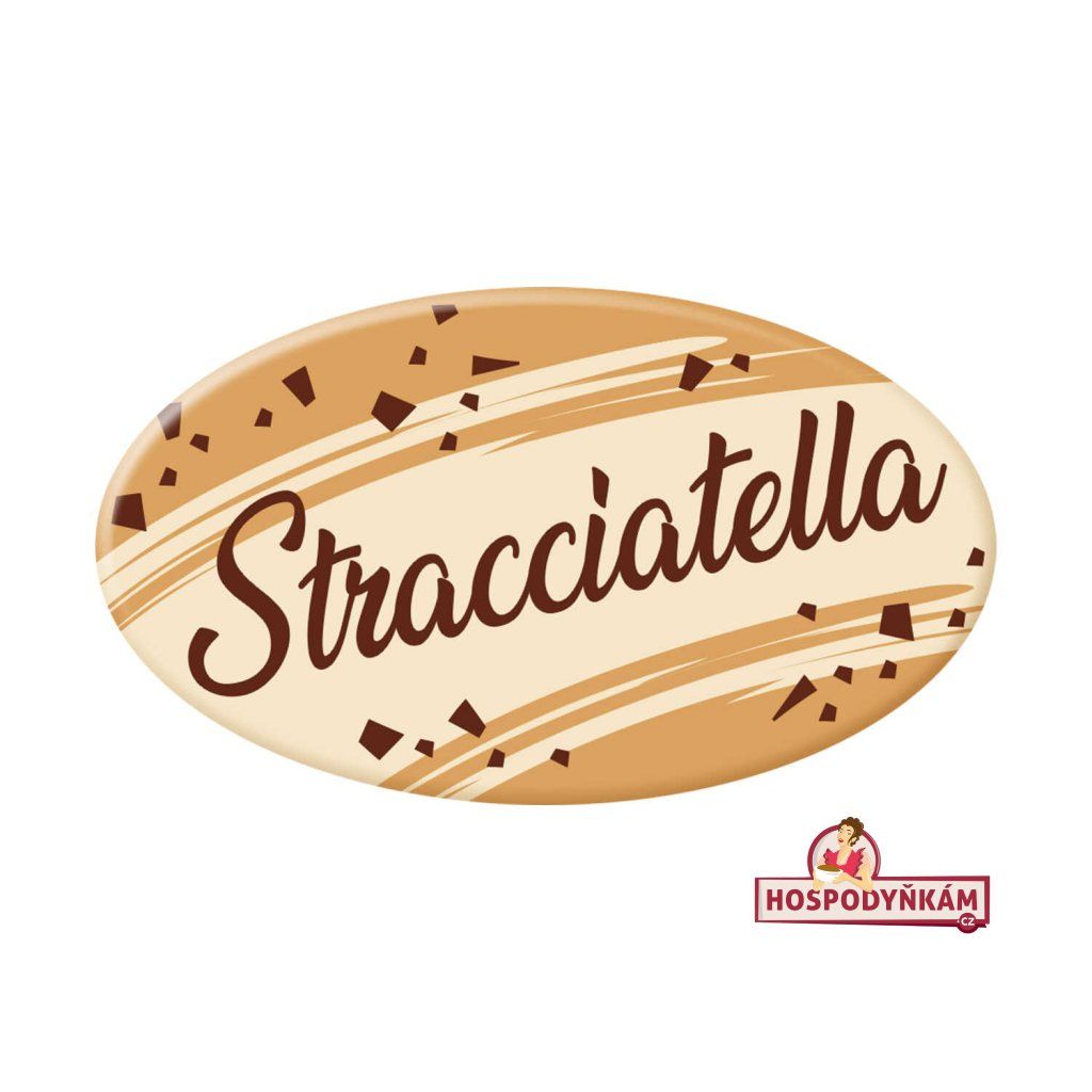 Oválná dekorace z bílé čokolády s ozdobným nápisem Stracciatella je určena k doplnění dezertů, zákusků a dortů s příchutí bílé čokolády s kousky. Rozměr dekorace: 4 x 2,5 cm.