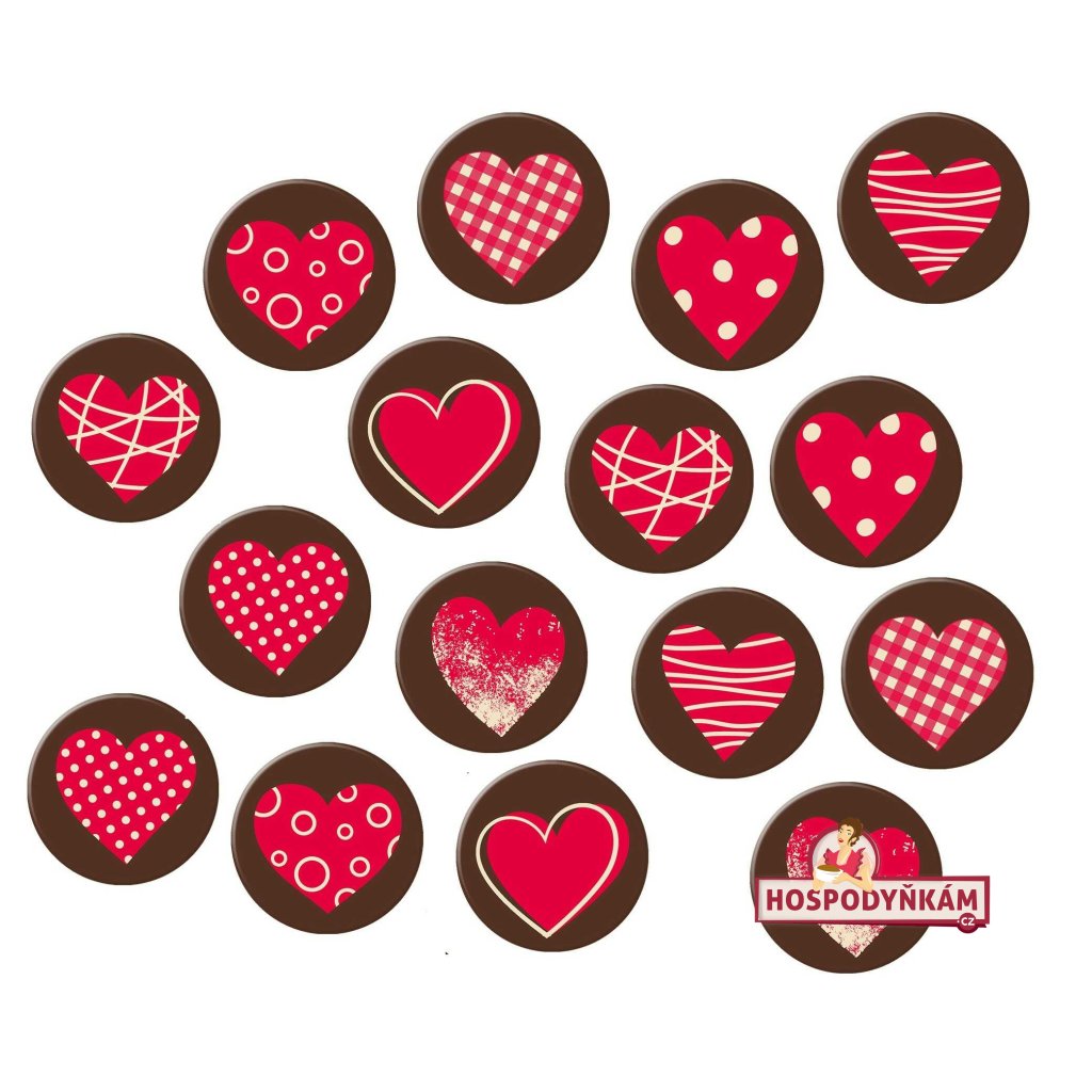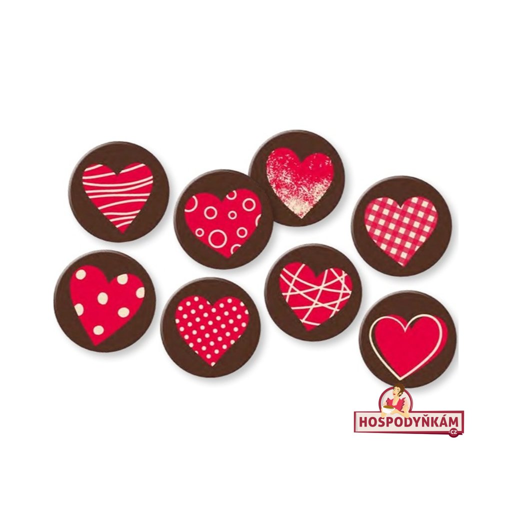 Elegantní kulatá dekorace z bílé čokolády s hnědým podkladem a výrazným červeným srdcem uprostřed v osmi různých motivech. Skvěle se hodí na zdobení dortů, cupcakes, dezertů nebo slavnostních cukrářských výrobků – ideální na Valentýna, svatby nebo narozeninové oslavy.