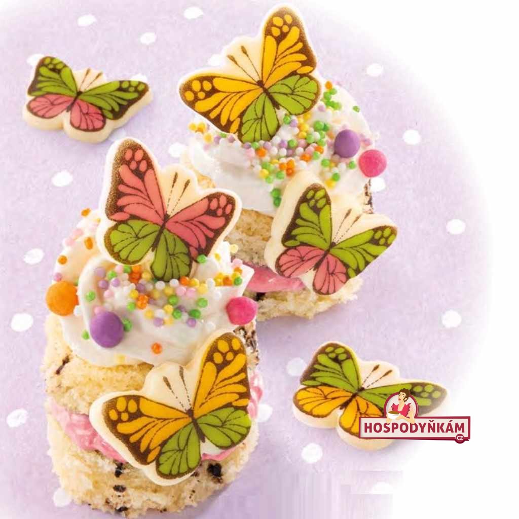 Krásní barevní motýlci z bílé čokolády jsou perfektní dekorací na dorty, muffiny, poháry i další cukrářské výrobky. Díky praktickému plastovému platu je snadno vyjmete a ihned použijete při zdobení.