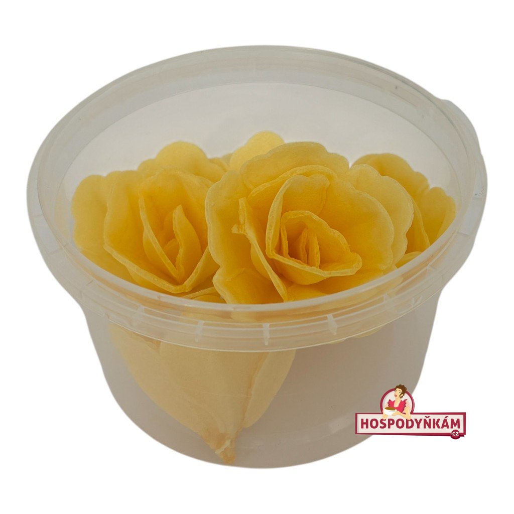 Krásné žluté květy z jedlého papíru dokonale imitují skutečnou růži a jsou ideální pro zdobení narozeninových, svatebních i dalších slavnostních dortů. Stačí je jednoduše zapíchnout do krému nebo cukrářské hmoty a během chvilky vytvoříte působivý květinový dort. Květy můžete libovolně kombinovat s dalšími cukrářskými posypy, například se sněhovými pusinkami nebo čokoládovými koulemi.