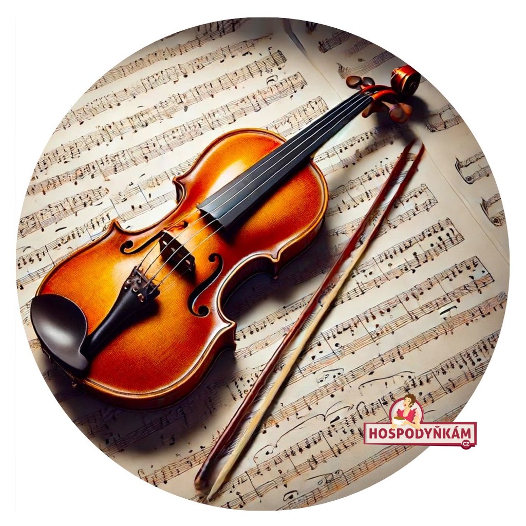 Jedlý papír na dort s motivem notového záznamu s houslemi může být pěknou ozdobou narozeninového dortu muzikantů.