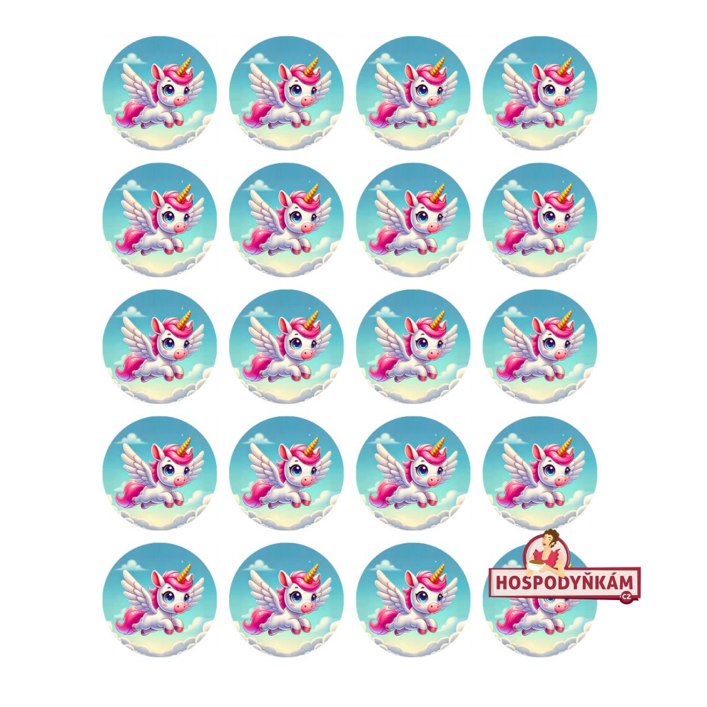 Jedlá oplatka na minizákusky a muffiny s motivem kresleného jednorožce. Jednotlivé obrázky je nutné nejdříve vystřihnout, a poté nalepit na zákusek.