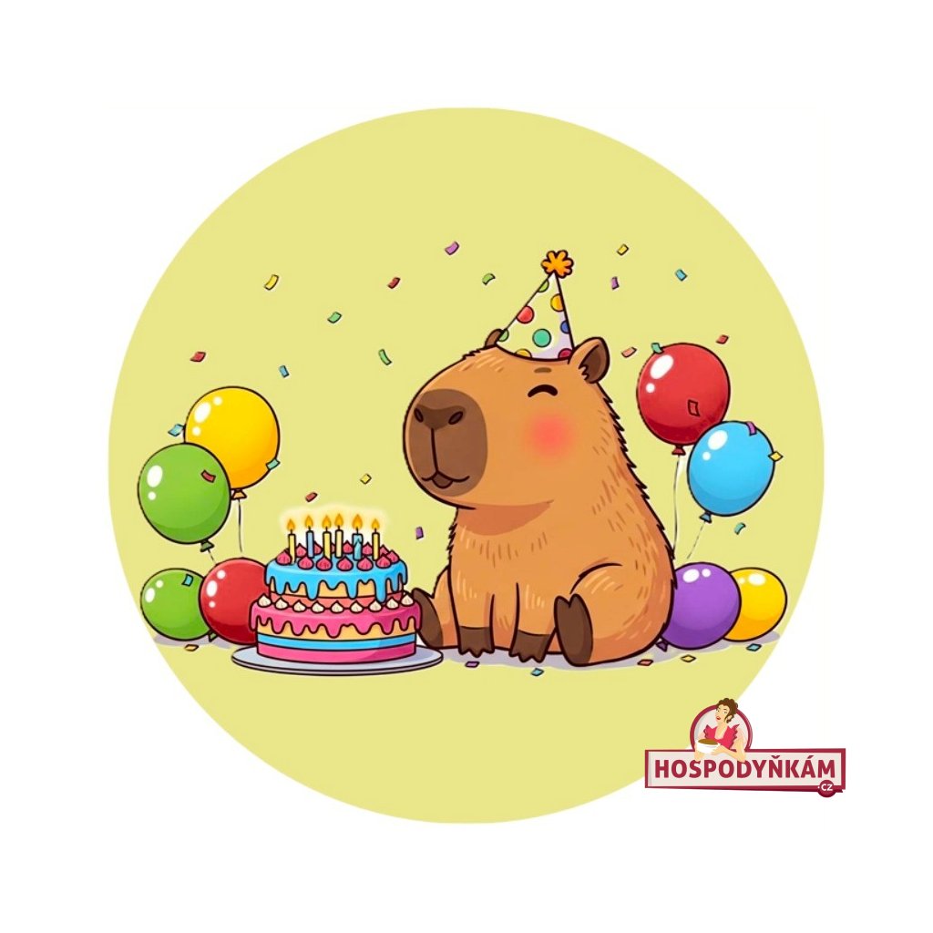 Oživte dětský narozeninový dort veselým jedlým obrázkem kapybary s dortem a balónky! Tento barevný jedlý papír je ideální pro rychlou a efektní dekoraci kulatých narozeninových dortů pro děti. Obrázek snadno aplikujete a během chvilky proměníte obyčejný dort v originální slavnostní dezert.