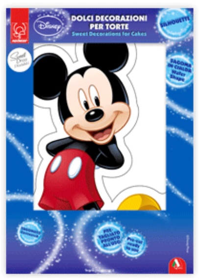 Jedlý papír na dort s motivem obrysu postavy myšáka Mickey Mouse. Obrázek jednoduše vyloupneme z oplatky a zdobíme dort. Obrázkový návod je na obalu výrobku.