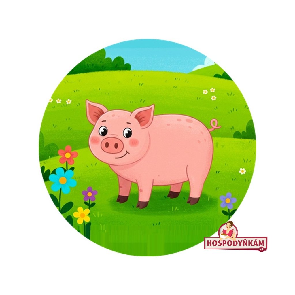 Jedlý obrázek prasátko. Kulatý obrázek o průměru 20 cm je tištěný na jedlou oplatku a nese motiv kresleného prasátka na louce. Tento produkt je ideální pro ozdobení dětských dortů a slavnostních moučníků.
