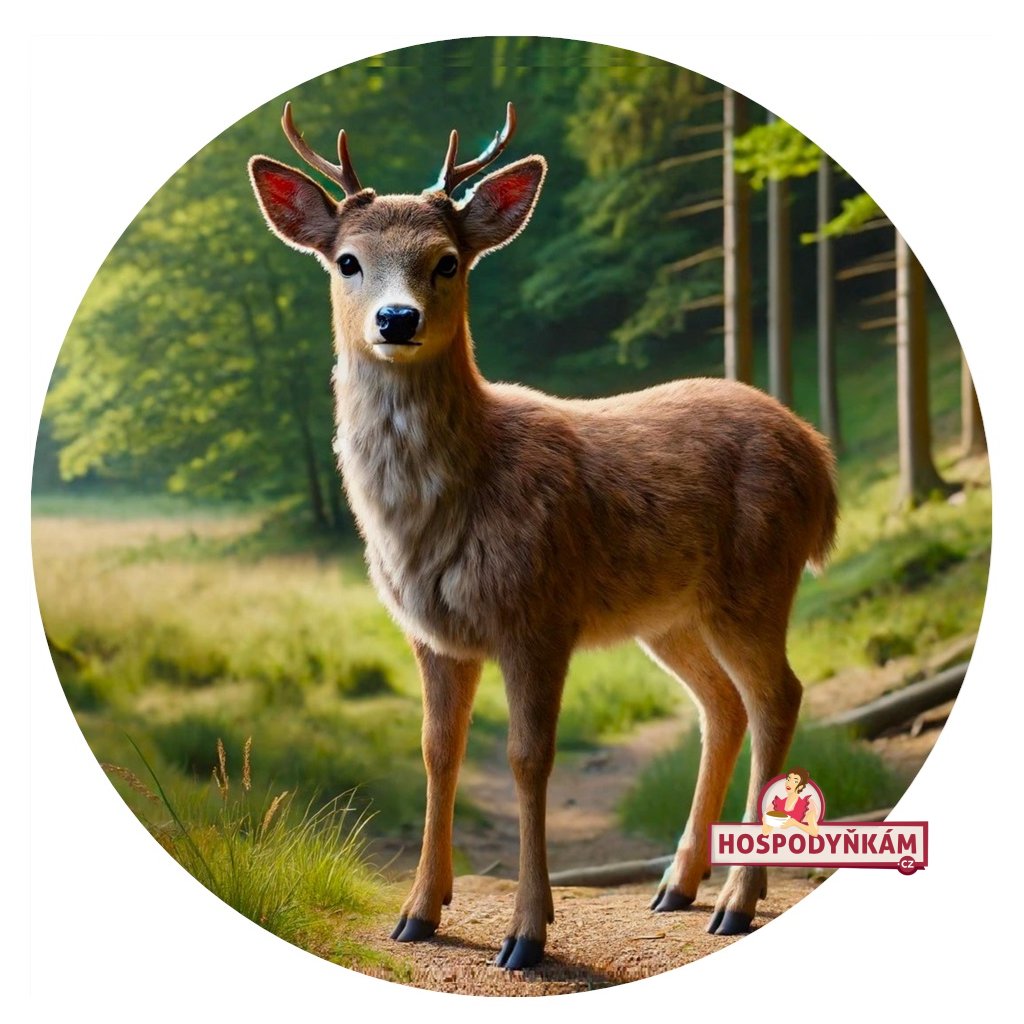 Jedlý papír s motivem srnce je tištěn na kulatou tenkou oplatku o průměru 20 cm a je určený k dekoraci dortů s mysliveckou tématikou, například na myslivecké plesy, oslavy či narozeniny myslivců.