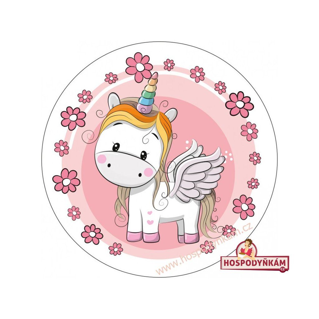 Jedlý obrázek na dort s kresleným bílým jednorožcem s růžovým pozadím a kytičkami bude krásnou ozdobou dívčích dortů.