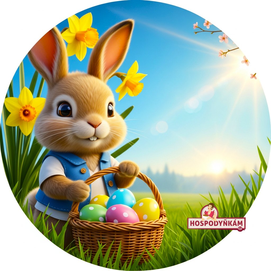 Jedlý obrázek s motivem velikonočního zajíčka v modré vestičce držícího proutěný košík plný kraslic je tištěn na jedlé oplatce, která se používá k ozdobení kulatých dortů. Oplatka má průměr 20cm a před použitím je nutné obrázek vystřinout.