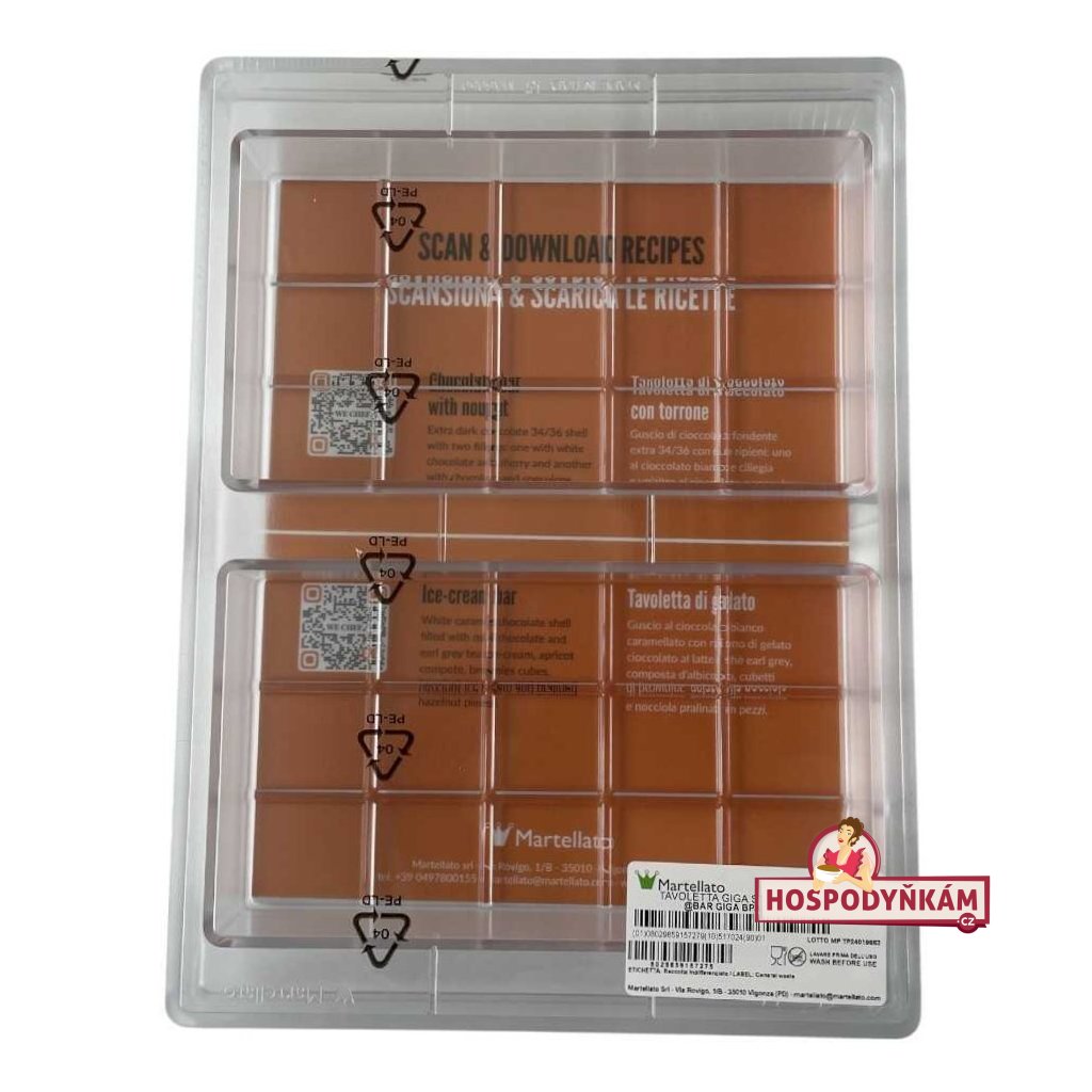 Forma Martellato Giga je ideálním pomocníkem pro všechny, kdo chtějí vytvářet profesionální tabulkové čokolády s bohatou náplní. Tato pevná plastová dvojforma umožňuje výrobu dvou velkých čokoládových tabulek najednou, přičemž každá z nich má rozměr 18 × 10 × 3,2 cm a hmotnost až 550 g. Díky extra hloubce lze čokoládu snadno plnit ořechy, sušeným ovocem nebo jinými náplněmi, což poskytuje široké možnosti kreativního využití.