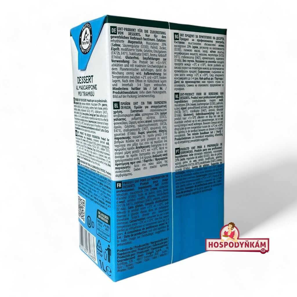 Rehydratované odstředěné MLÉKO, 20% mascarpone (SMETANA, regulátor kyselosti E330), palmový olej, cukr, VAJEČNÝ žloutek, modifikovaný škrob, želatina, emulgátory (E472b, E471), stabilizátor E407, aroma, barvivo E160a.