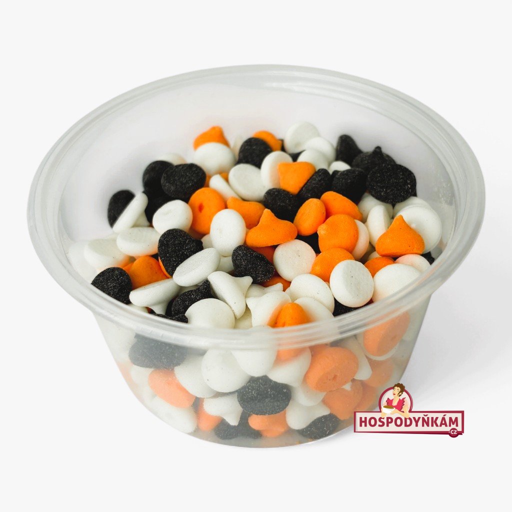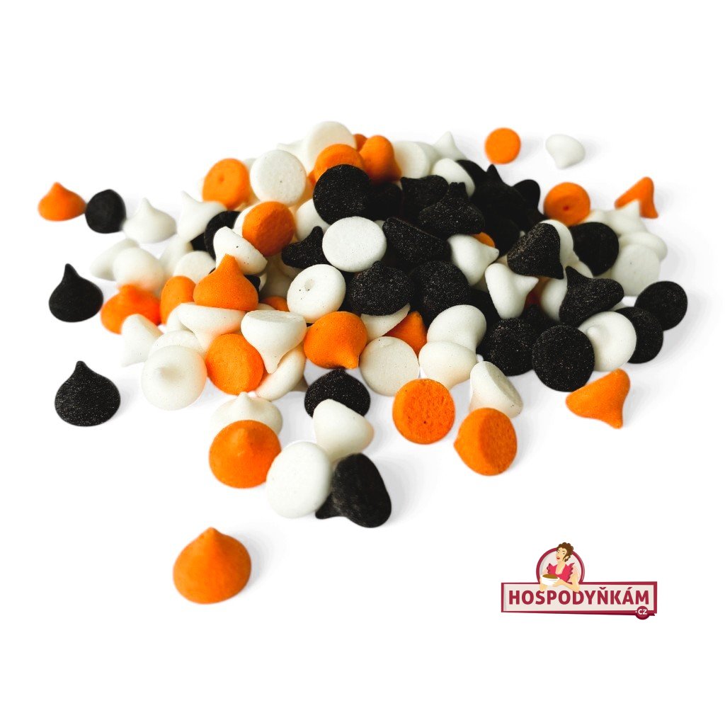 Extra malé hladké sněhové pusinky v typických halloweenských barvách – bílé, oranžové a černé – jsou skvělou volbou pro originální zdobení dortů, cupcakes, dezertů nebo pohárů. Díky drobnému průměru 8 mm a křupavé konzistenci snadno vytvoříte efektní dekorace na vaše sladké výtvory. V balení najdete přibližně 265 kusů mini pusinek.