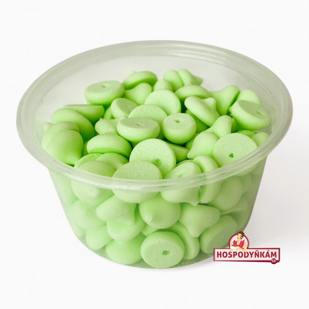 Jemné zelené mini pusinky s hladkou špičkou a neutrální sladkou chutí jsou skvělou volbou pro ozdobení dortů, cupcakes, dezertů i zmrzlinových pohárů. Díky drobné velikosti dokonalé lehkosti perfektně doplní každý sladký výtvor a hodí se ke všem druhům krémů, do kterých se neboří, ale drží krásně tam, kam je položíme.